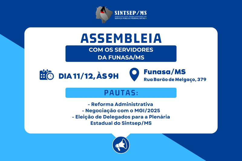 O Sintsep/MS realiza, nesta quinta-feira, 11 de dezembro, uma assembleia destinada aos servidores da Funasa em Campo Grande. O encontro acontecerá às 9h, na sede da Funasa, localizada na Rua Barão de Melgaço, 379, em Campo Grande.