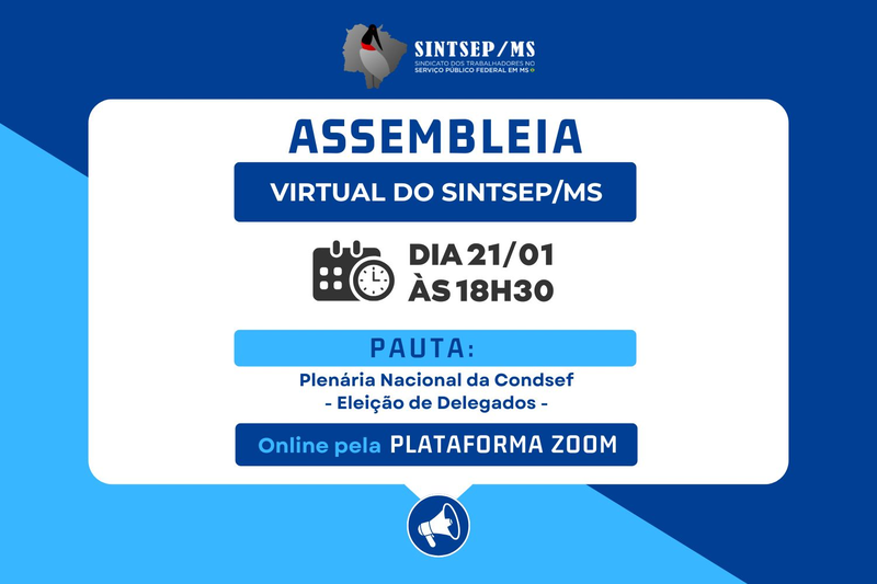 O Sintsep/MS realiza, na próxima quarta-feira, 21 de janeiro de 2026, uma Assembleia Geral Virtual, com início às 18h30, horário de Campo Grande.